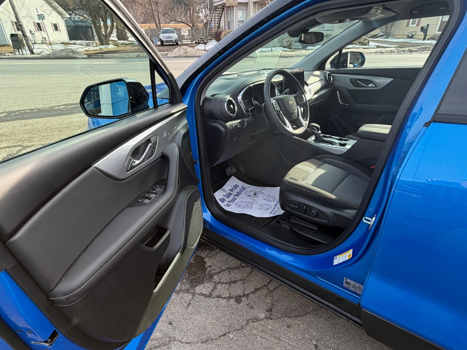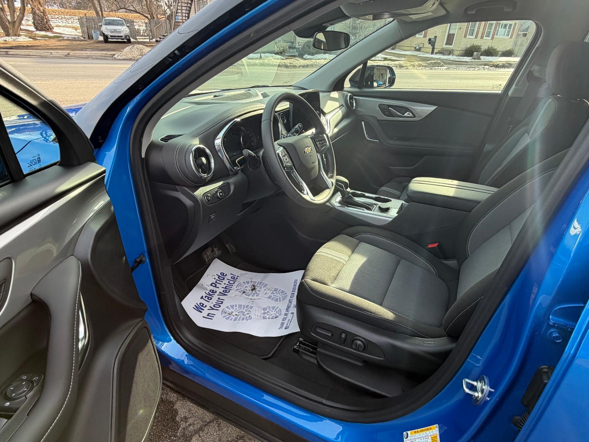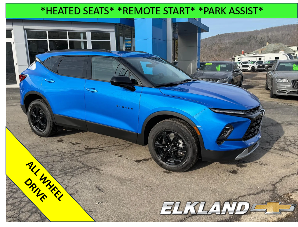 New 2026 Chevy Blazer LT AWD Midnight Edition in Riptide Blue Metallic. Equipped with cloth interior, Heated seats, Remote start, Power driver seat, 2.0L Turbo engine, Lane keep assist, Rear park assist, and more.