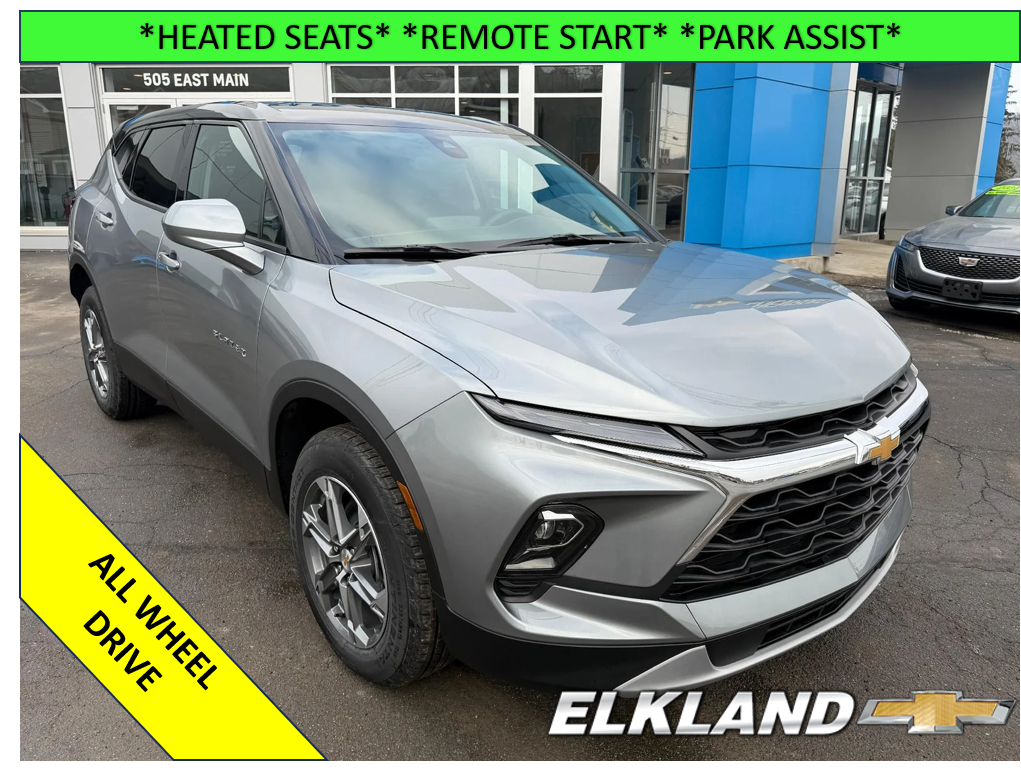 New 2026 Chevy Blazer LT AWD in Sterling Gray Metallic. Equipped with cloth interior, Heated seats, Remote start, Power driver seat, 2.0L Turbo engine, Lane keep assist, Rear park assist, Black roof, and more.