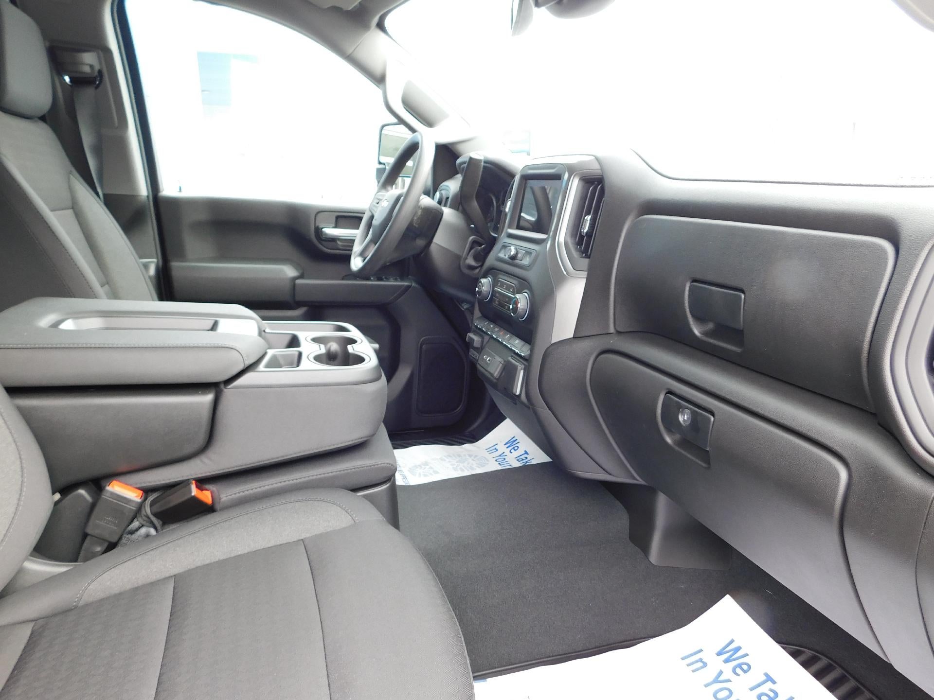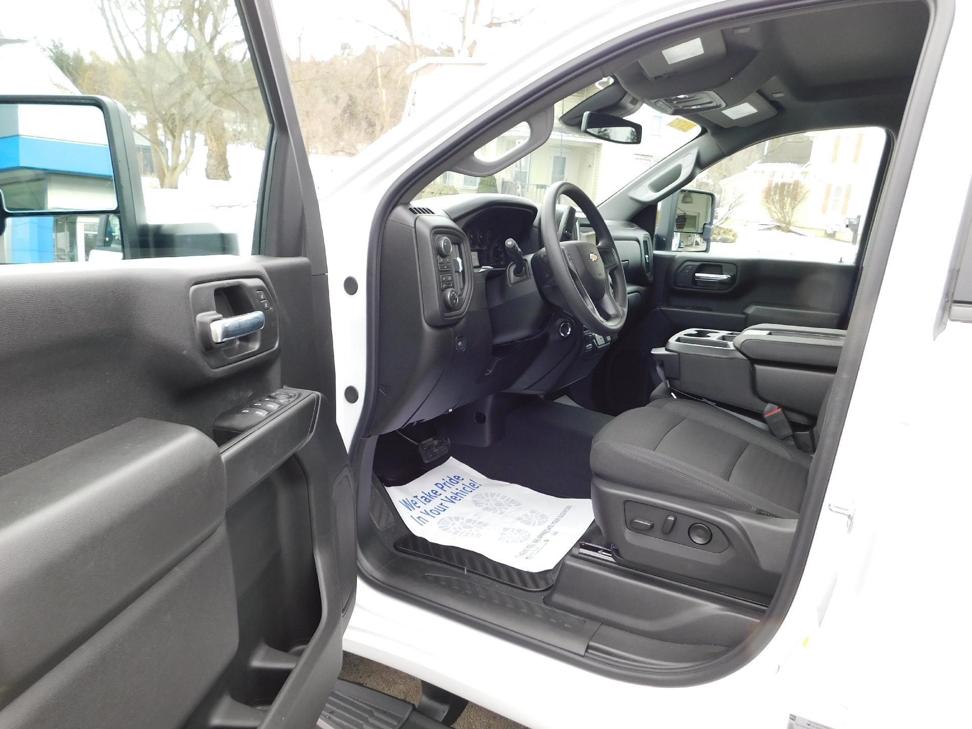 New 2026 Chevy Silverado 2500 Crew Cab Custom 6.6L GAS in Summit White. Equipped with black Cloth interior, Power driver seat, Remote start, Trailering package, Blind zone alerts, Snow Plow Prep package, and more.