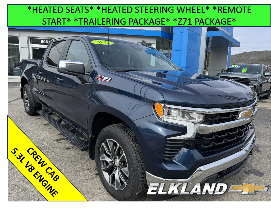 One owner, Used 2022 Chevy Silverado 1500 Crew Cab Standard Bed (6 1/2 Feet) LT 5.3L V8 in Northsky Blue Metallic. Equipped with cloth interior, Heated seats, Heated steering wheel, Z71 Package, Power sliding rear window, 20" Aluminum wheels, Trailering package with integrated trailer brake controller, and more.