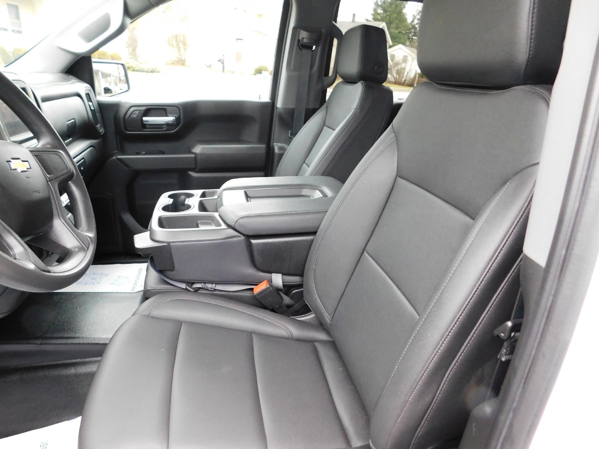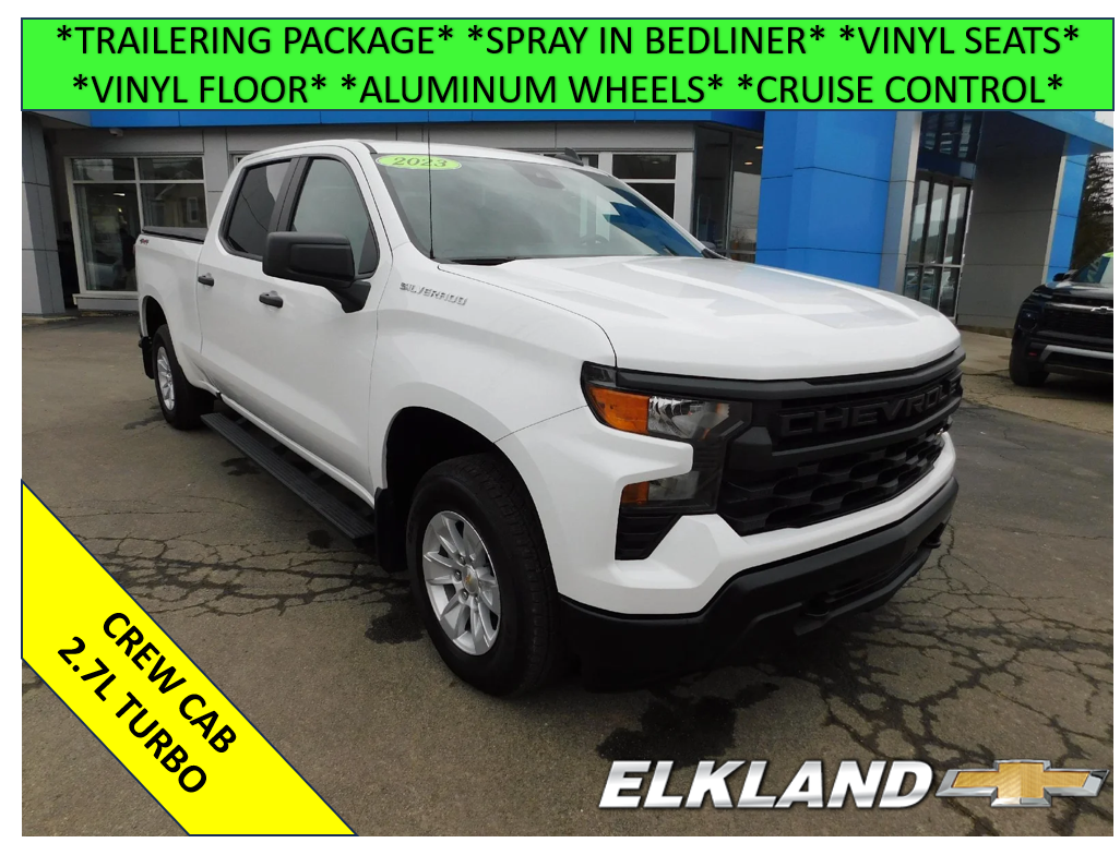 Used 2023 Chevy Silverado 4X4 1500 Crew Cab Standard Bed WT 2.7L Turbo in Summit White. Equipped with black Vinyl interior, Vinyl floors, Trailering package with integrated trailer package, Spray in bedliner, Cruise control, Lane keep assist, Wireless Apple Carplay/Android Auto, and more.