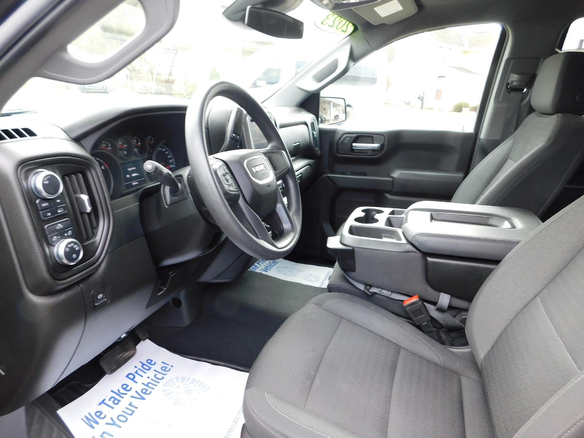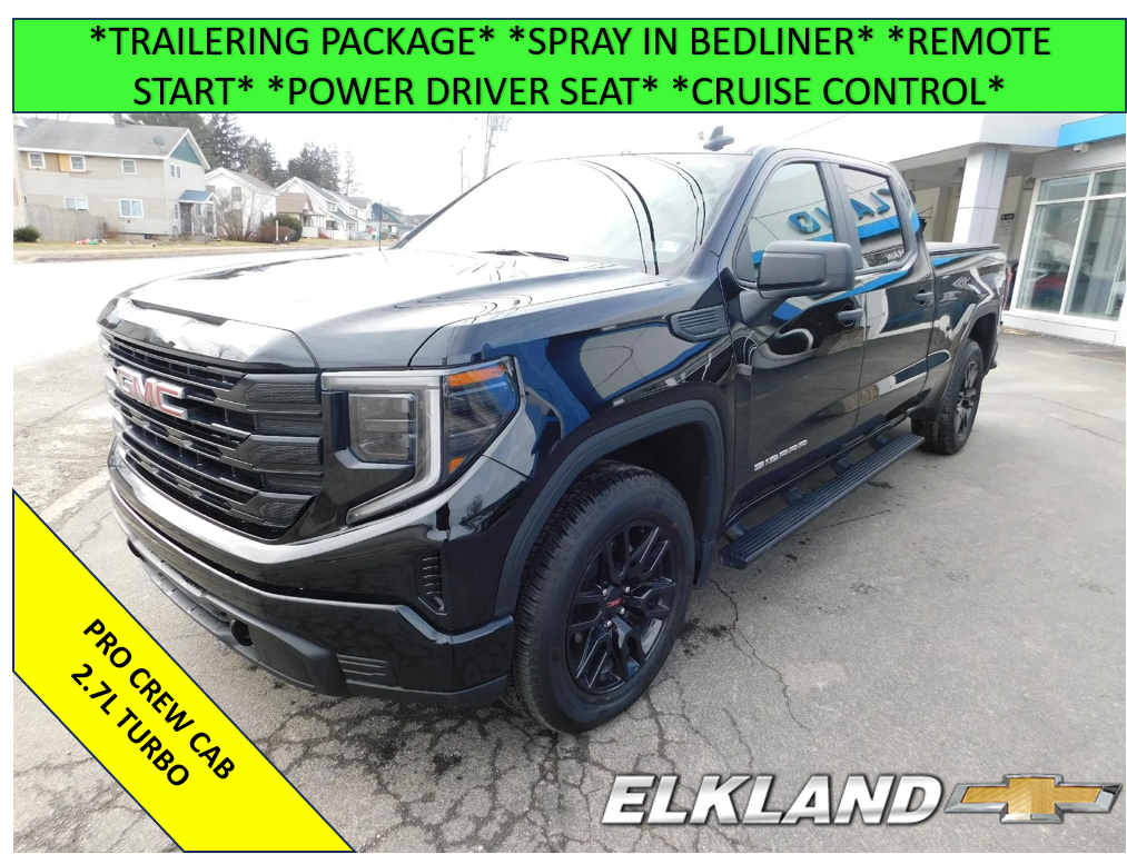 Used 2023 GMC Sierra 1500 Crew Cab Standard Bed 4X4 Pro 2.7L Turbo in Onyx Black. Equipped with black Cloth interior, Power driver seat, Remote start, Trailering package, Cruise control, Black gloss wheels, Wireless Apple Carplay/Android Auto and more.