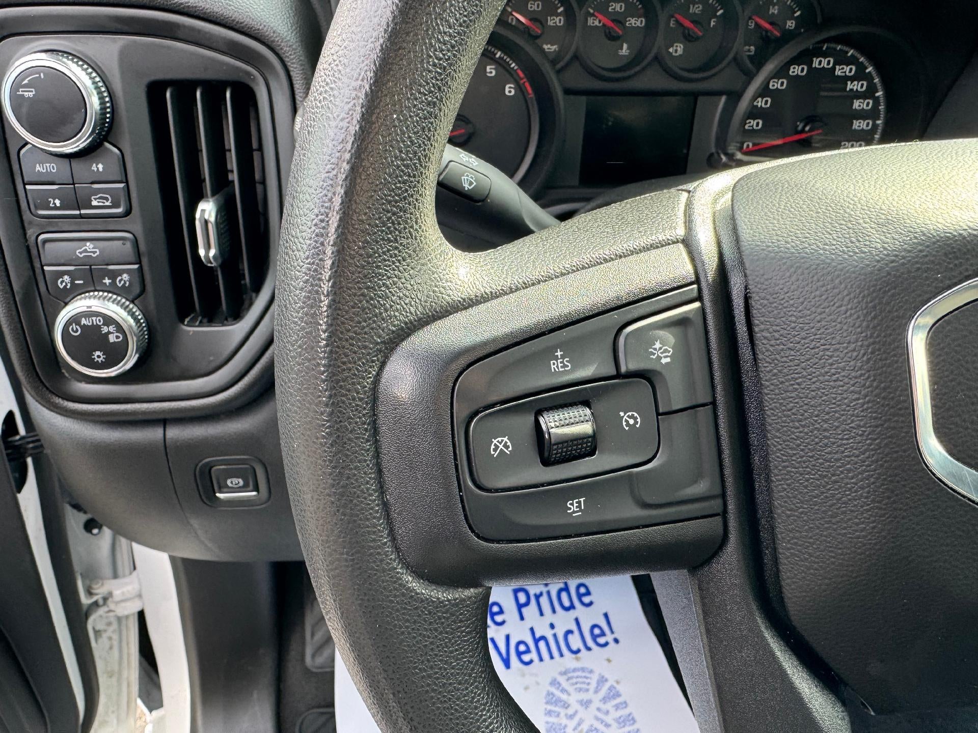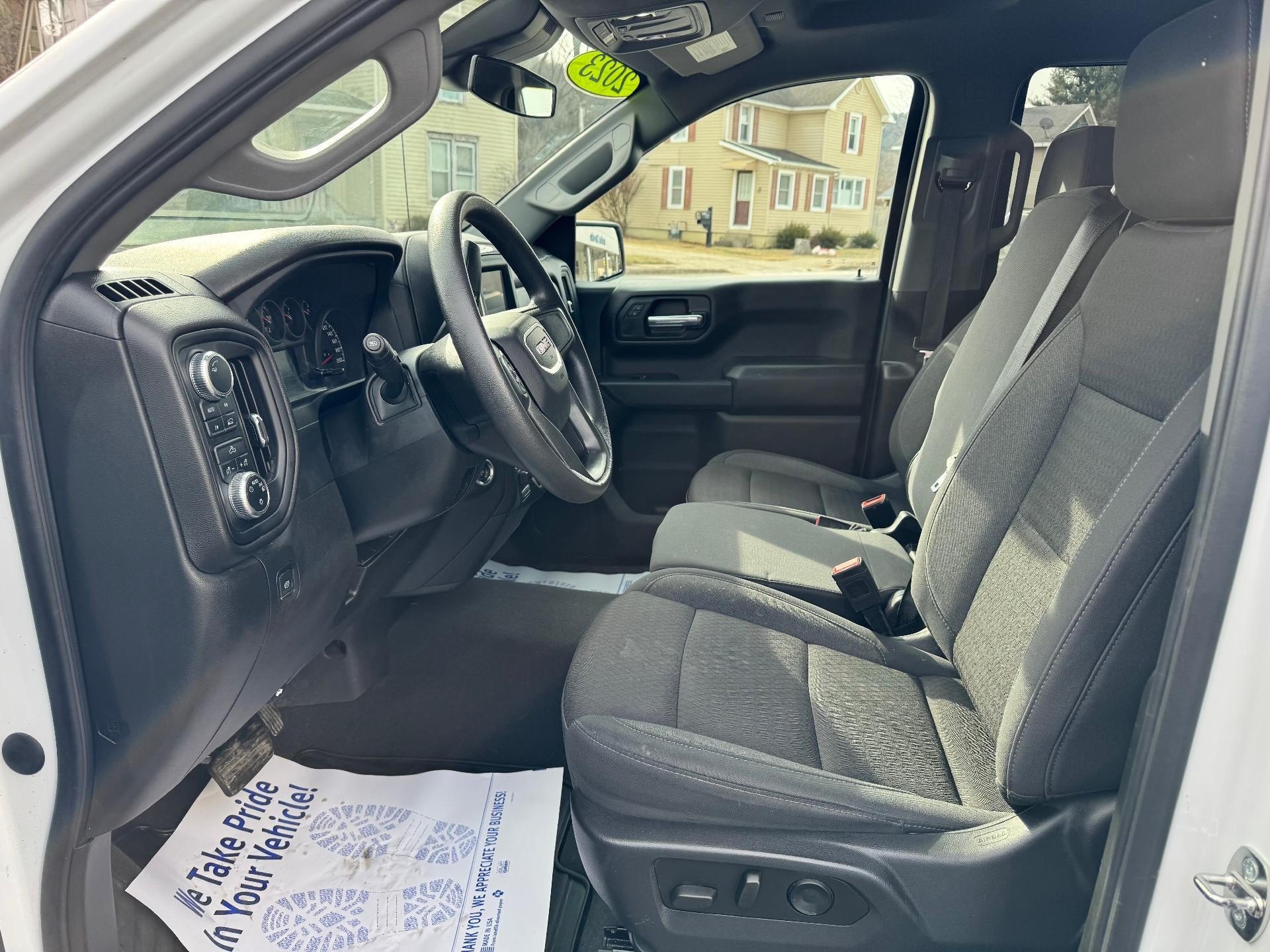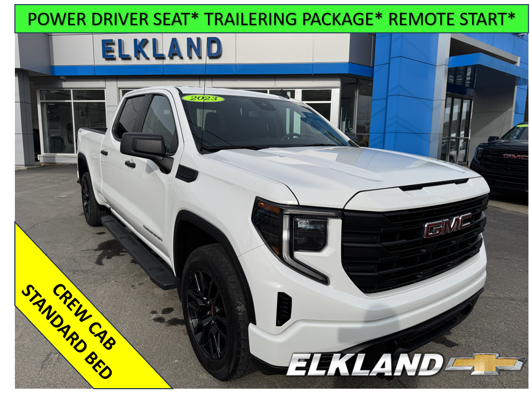 Used 2023 GMC Sierra 1500 Crew Cab 4X4 Pro Standard Bed 2.7L Turbo in Summit White. Equipped with black Cloth interior, Power driver seat, Remote start, Trailering package, Cruise control, Black gloss wheels, Wireless Apple Carplay/Android Auto and more.