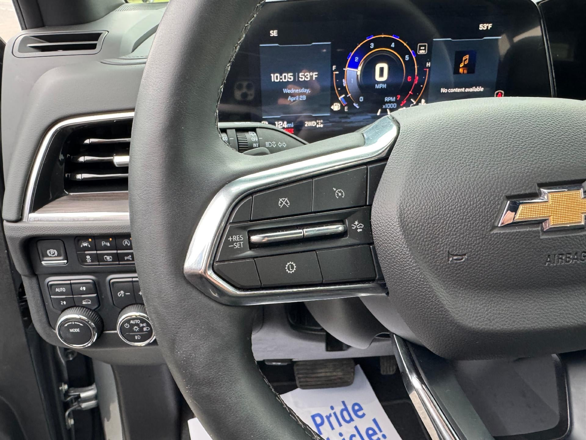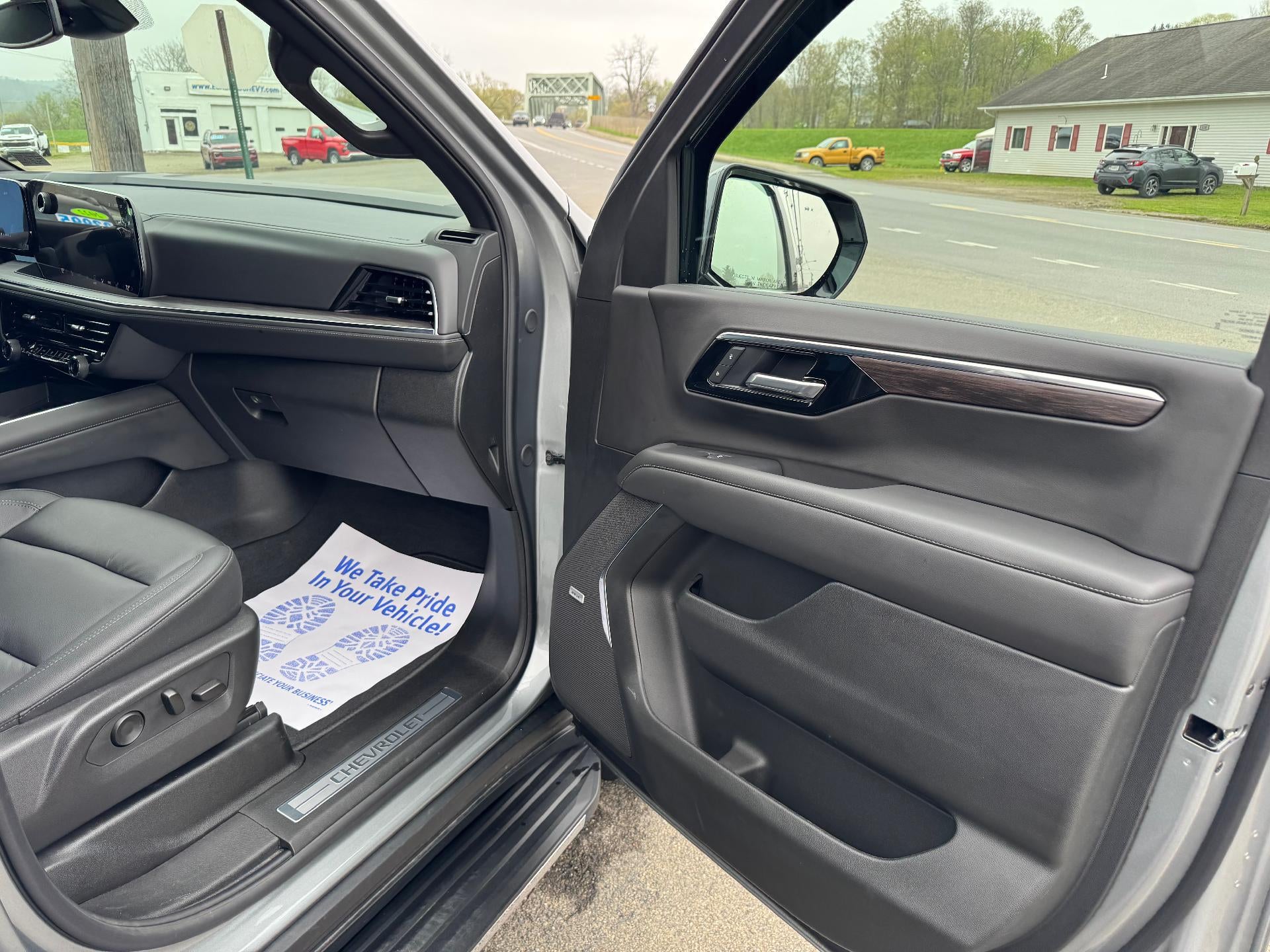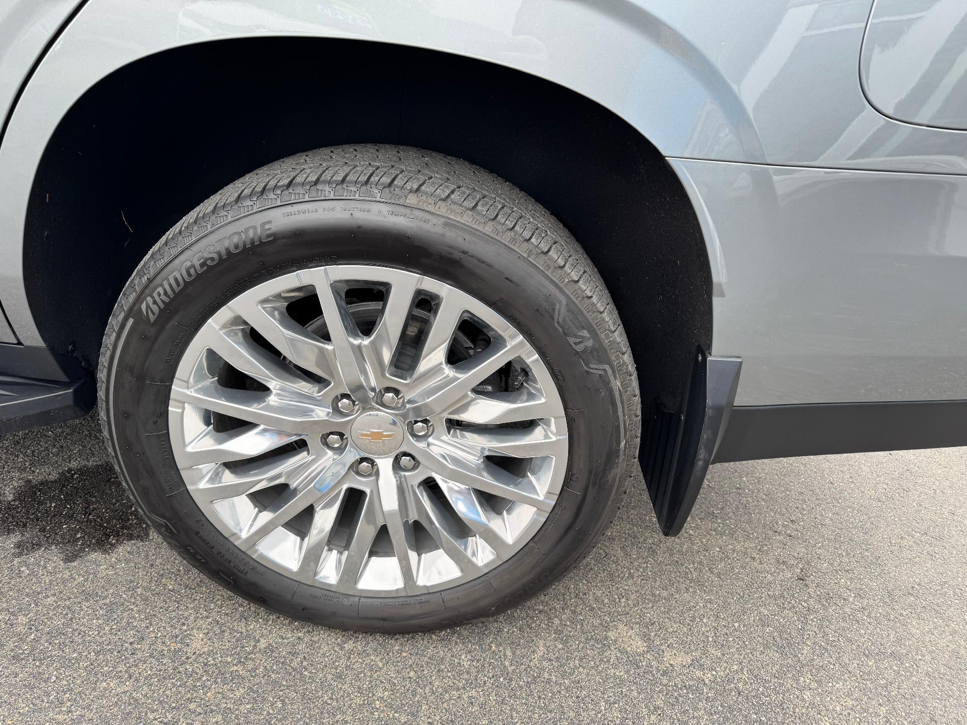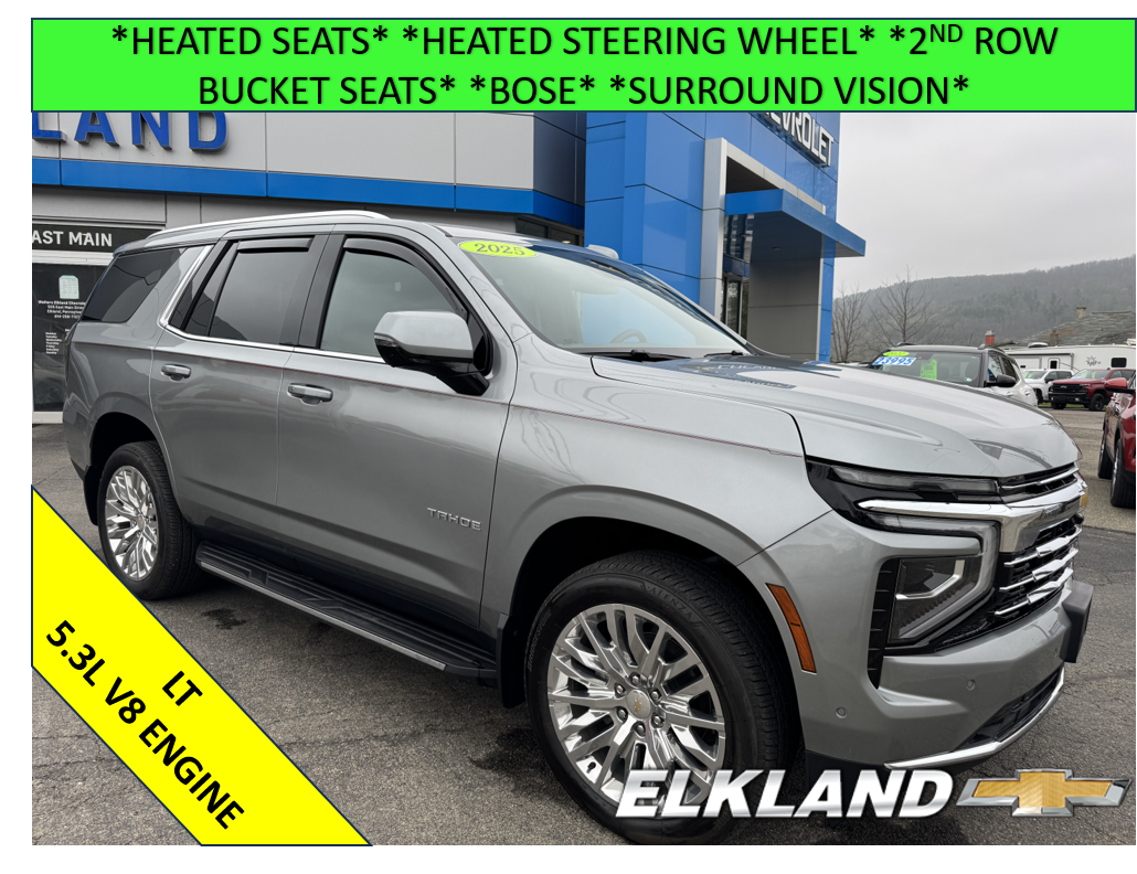 Used 2025 Chevy Tahoe LT 4X4 5.3L V8 in Sterling Gray Metallic. Equipped with black Leather interior, Heated seats, Heated steering wheel, 2nd Row bucket seats, 22" Polished Aluminum wheels, Surround vision, Bose speakers, Power liftgate, and more.